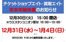 12月30日(火) 15:00閉店 ※ウエスタンユニオン受付10:00~13:00 12月31日(水)~1月4日(日) 休業 1月5日(月) 9:30~通常営業いたします ※ウエスタンユニオン受付10:00~ ★★★★★★★★★★★★★★★★★★★★★★★★ ◇ 買取エイト◇〒630-8225奈良県奈良市西御門町27-5TEL 0120-5...