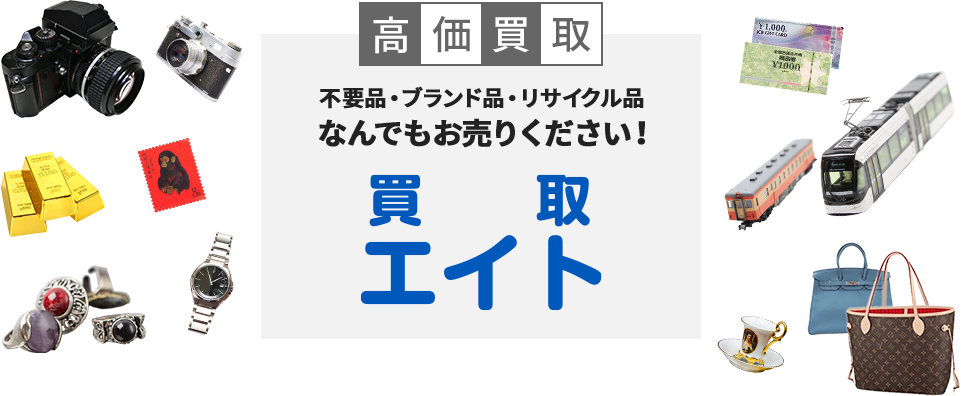 買取 エイトの取扱品目一覧 ※お問い合わせください。 貴金属 リング、ネックレス、ピアス、イヤリング、金、プラチナ、シルバー、銀盃、工業用地金、歯科材 金券・株主優待券 商品券・旅行券・図書カード・クオカード・テレホンカード・金券全般 各種株主優待券ほか 記念金貨・貨幣セット 10万円金貨・5万円金貨・国内海外の金貨・銀貨・貨幣セットほか 古銭・紙幣・大判・小判 東京五輪100円・1,000円銀貨 国内・海外の古銭・穴銭・古紙幣ほか レトロアイテム・おもちゃ・ホビー ソフビ人形、ブリキ・超合金玩具、レトロユニフォーム、懐かしのアニメ・キャラクターグッズ ほか 宝石・ダイヤ ルビー、エメラルド、サファイア、アレキサンドライト、タンザナイト ほか ブランド食器・陶器 マイセン、ウェッジウッド、リヤドロ、ヘレンド、バカラグラス ほか 日本切手・中国切手・収入印紙 記念切手、通常切手・シート切手、バラ切手、各種ハガキ・収入印紙 カメラ・レンズ・スマホ・タブレット フィルムカメラ・デジタルカメラ・iPhone・iPad 各種アクセサリー 鉄道模型・鉄道部品 Nゲージ、HOゲージ、サボ、ヘッドマーク ほか 勲章・記念章 勲章・記念章 絵画・古美術・骨董 絵画・古美術・骨董 ブランド品 バッグ・財布・小物・アクセサリー・香水など 時計 ロレックス、オメガ、カルティエ、ブルガリ、セイコー、シチズン、カシオ ほか